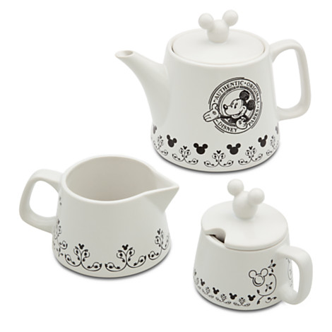 I love the scrollwork and simple black and white design. The knobs on both the teapot and the sugar bowl are the Little Guy himself. And the “Authentic Original Disney Parks” logo will remind you of your last happy visit to the parks.