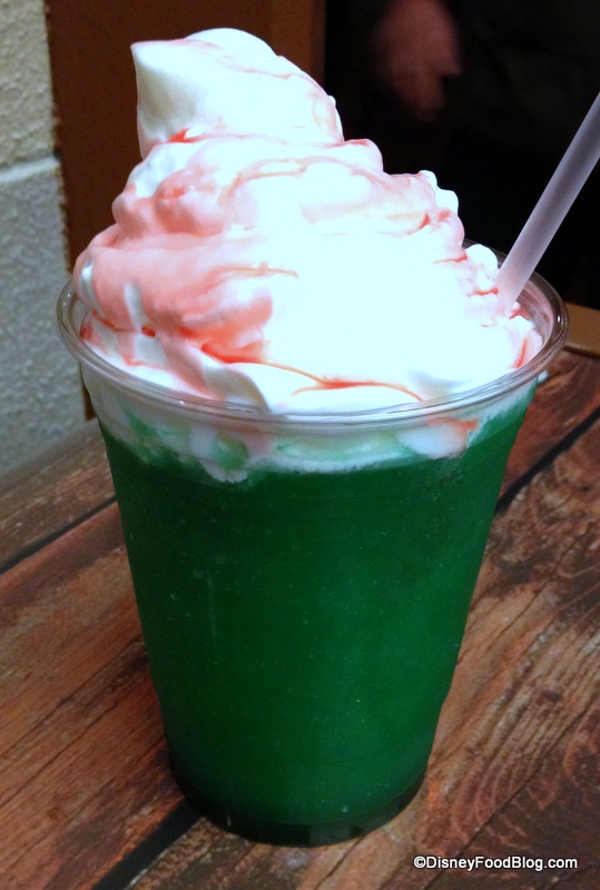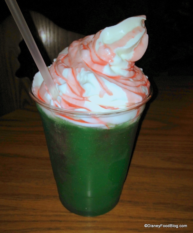 As you can see, the vibrant, dark green slush is topped with a generous mound of whipped cream — even more than the menu pic, actually! Score!
