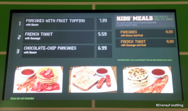 We had a chance to stop by the recently refurbished End Zone Food Court at All Star Sports to check out the breakfast menu. Along with some traditional Disney favorites (including the Bounty Platter and Mickey Waffles), this is also the place you can start your day with Chocolate Chip Pancakes… Good morning!!