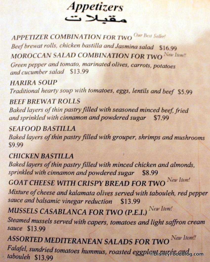 Restaurant Marrakesh is amazing! Healthy, fresh dishes that, unlike the food at most World Showcase restaurants, I can’t get in my hometown. Shish kabobs are totally mainstream, as you say, AJ, but a lot of the other items are much harder to come by. I agree with John’s assessment, the prices are a bit high and the pace of the meal can be slow. However, Restaurant Marrakesh succeeds in really transporting you to North Africa, and that’s honestly what makes it so special.