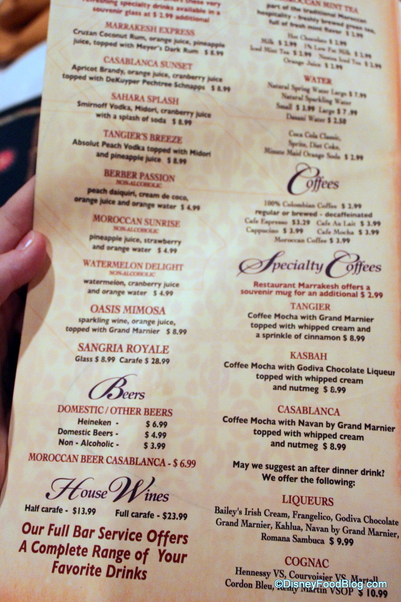 As with other restaurants in World Showcase, Restaurant Marrakesh strives to give guests an authentic taste of the country it represents. To that end, there are some Moroccan wines featured here. It’s a great touch, since these wines aren’t commonly available in the United States.