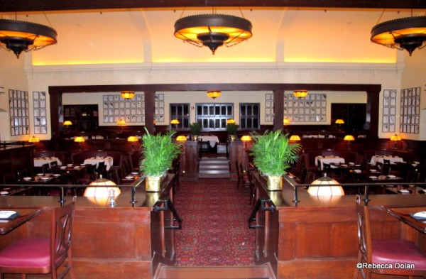 Large art deco-esque chandeliers light the room and rich wood accents the walls. Entrants step first onto one of the overlooks, allowing a full view of their dining companions – famous or otherwise.