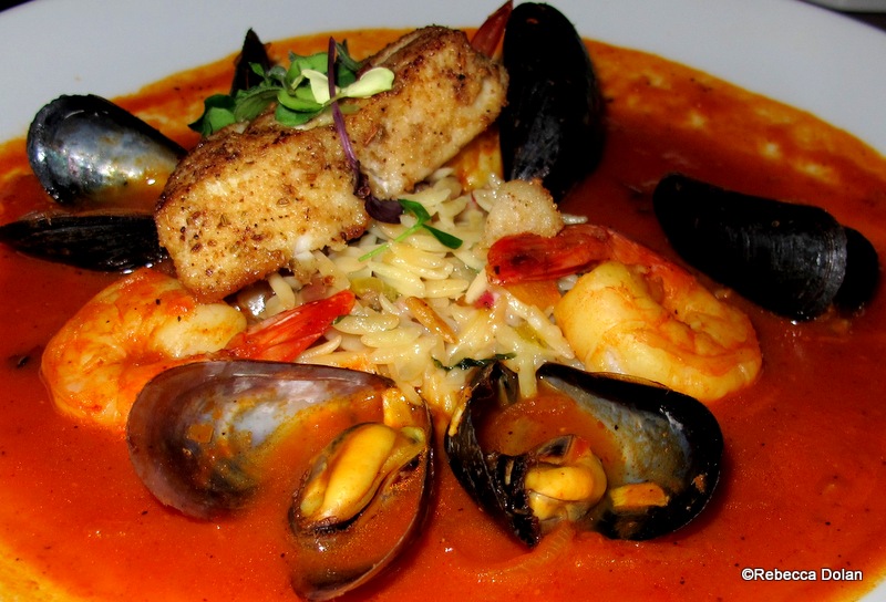 A bed of orzo pasta gave the dish some heft, and the whole lot is bathed in a rich (though slightly salty) tomato broth.