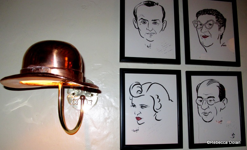 The constellation of stars’ caricatures continues onto these walls, from which bronze derby lamps hang over tables.