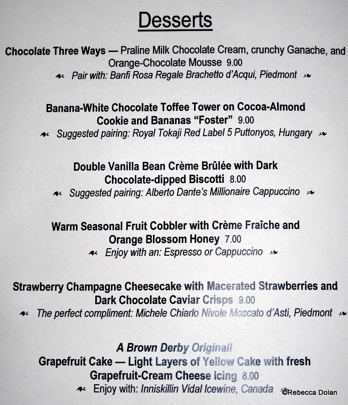 I had never been impressed with my visits to the Brown Derby in the past, but this visit changed my mind. There’s a lot to be said about food that’s gourmet and well-presented but not fussy, and these dishes earned high marks for both preparation and flavor.