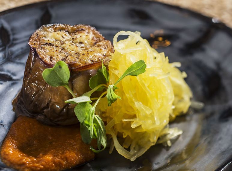 Land-grown Eggplant “Scallop” with Romesco Sauce and Spaghetti Squash from the Urban Farm Eats Outdoor Kitchen