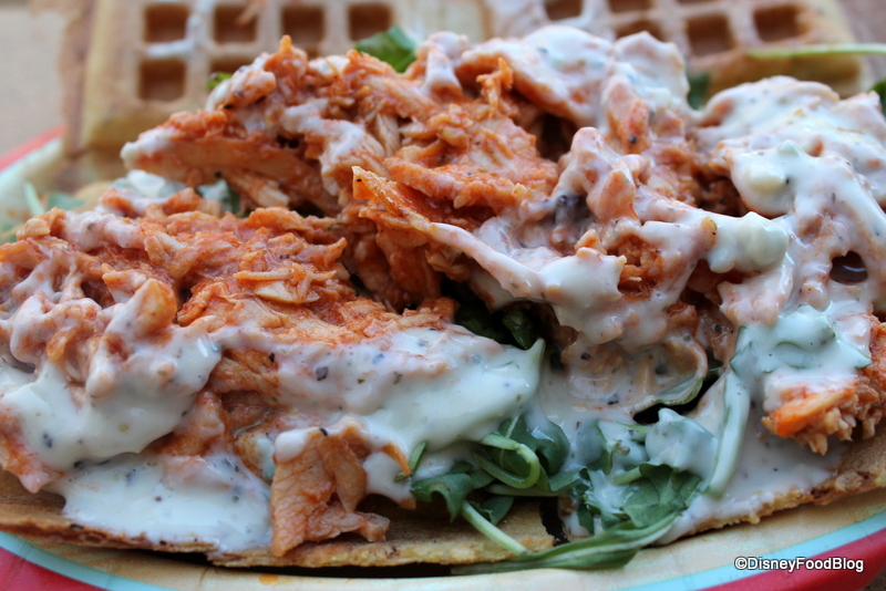 Anyway, on a recent visit to Animal Kingdom, I noticed something special was briefly back on the menu. It’s a little hard to catch since it’s only offered on “peak crowd level” days, so it was great to spot it: the Pulled Buffalo Chicken Waffle Sandwich! Seriously? You ask? YES! I reply!