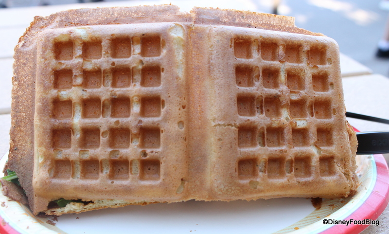 Now, Waffle Sandwiches aren’t new to Disney World. At Magic Kingdom’s Sleepy Hollow Refreshments, the featured waffle sandwiches are the Sweet and Spicy Chicken, the Ham, Prosciutto, and Swiss Cheese, and Nutella and Fresh Fruit. Even Epcot got in the game for a while over the holidays with a Sweet Potato Casserole Waffle and a Savory Seasonal Waffle (think Thanksgiving in a waffle!).