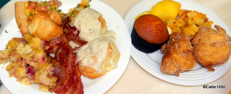 There was sausage, bacon, biscuits, and sausage gravy too. My husband is a HUGE fan of sausage gravy and MUST try it whenever a menu offers it – and he really loved this one. The biscuits were on the dry side, but the gravy made it all better; creamy and just the right amount of spice!