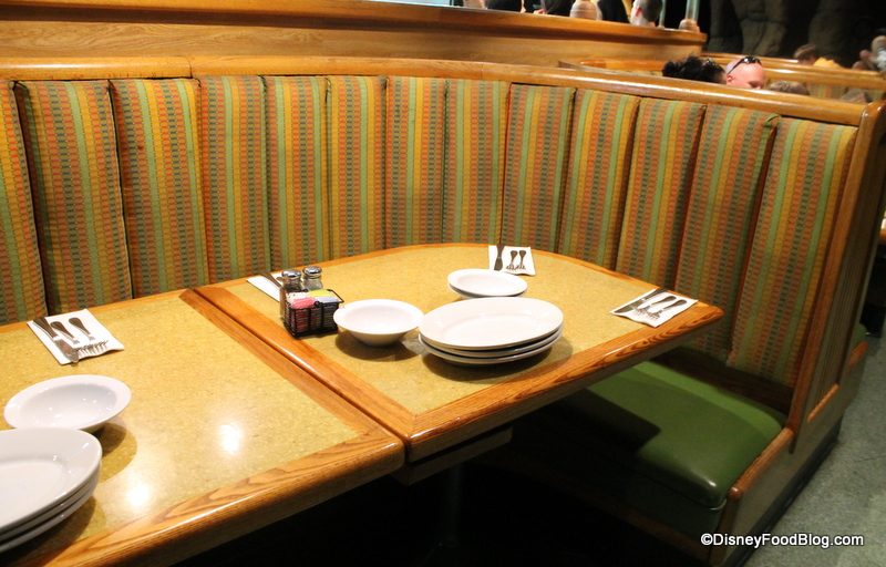 The booths provide more of a “front row seat” experience for the attraction, so it’s worth asking at check-in to see if you can get one. I wasn’t expecting a booth since it was just my husband and me, but several of the booths are divided with drop-leaf tables, allowing for a larger family on one side, and a pair on the other. The drop-leaf, of course, can be raised to accommodate a larger group, if needed.