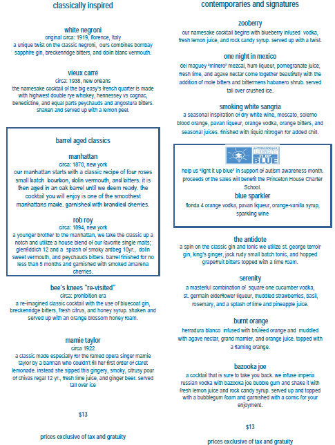 We loved the Smoking White Sangria on our last visit; and, of course, the classic zooberry returns. Also, notice a new drink in honor of Autism Awareness Month that benefits the Princeton House Charter School!