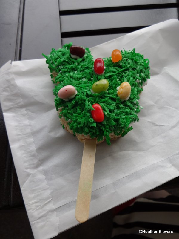 Available in chocolate, vanilla & red velvet, the Mickey ears are made from marshmallows while a bed of dyed coconut Easter grass serves as the base for the Jelly Belly Easter Eggs that top it. We chose vanilla since our last two were chocolate.