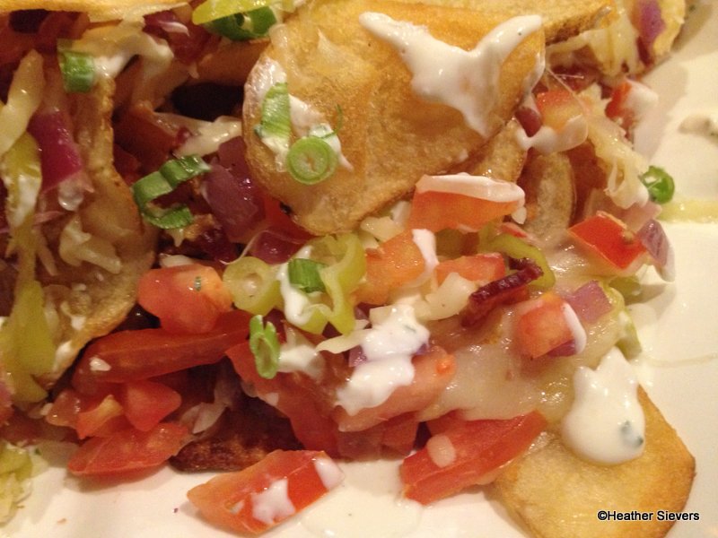 House made potato chips with Monterey Jack, Blue Cheese, Applewood Smoked Bacon, Scallions, Tomatoes, Pepperoncini, Grilled Onions, and Sour Cream. Yep! Like home made potato chip nachos!!!