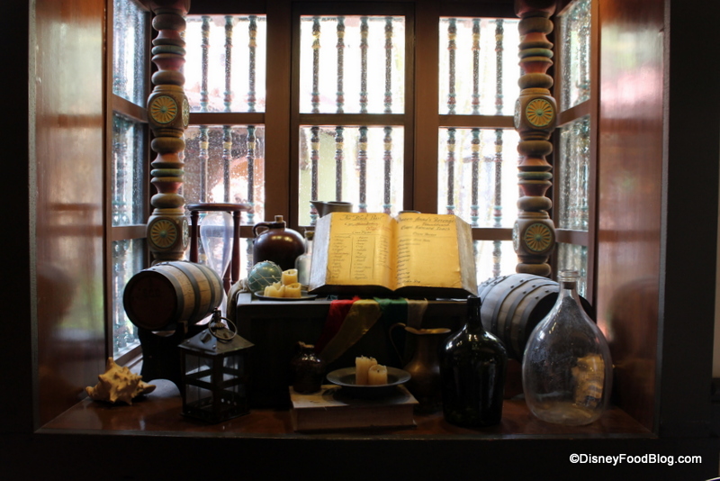 By the way, you can enjoy some of the details of Tortuga Tavern almost anytime, even if it’s not in operation. The room with the Toppings Bar also serves as a spot for those playing the “Sorcerers of the Magic Kingdom” game (as identified by the “Sorcerers” symbol on the floor in front of the fireplace).