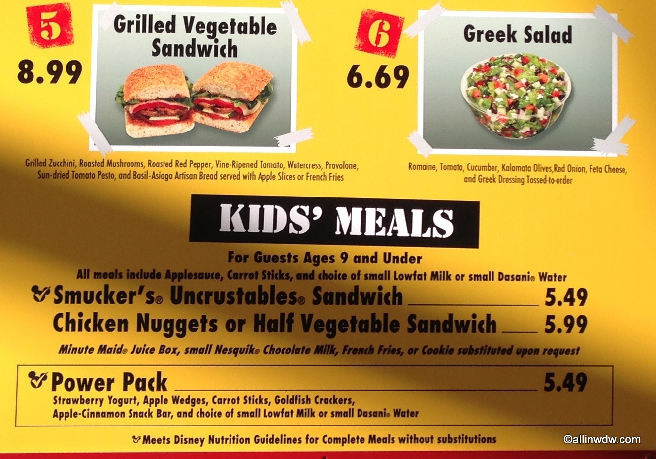 We’ve never eaten here because there is nothing that would appeal to my son, Mr. Fried Foods. We usually eat at Backlot Express, where the veggie sandwich is a great alternative to burgers and chicken, and the drinks are refillable. You can also score a seasonal cupcake there for your CS dessert. Last two trips we also ate at ABC. My son loves the burgers and chicken (of course), and I was amazed by the high quality of the salmon salad. I could see the CM adding greens to a big bowl and then tossing it with dressing before plating it for me, so getting dressings on the side shouldn’t be an issue. The slab of warm salmon was perfect. Now my husband has a very limited diet, so we are even less likely to try Studio Catering, although that Greek salad does look good!