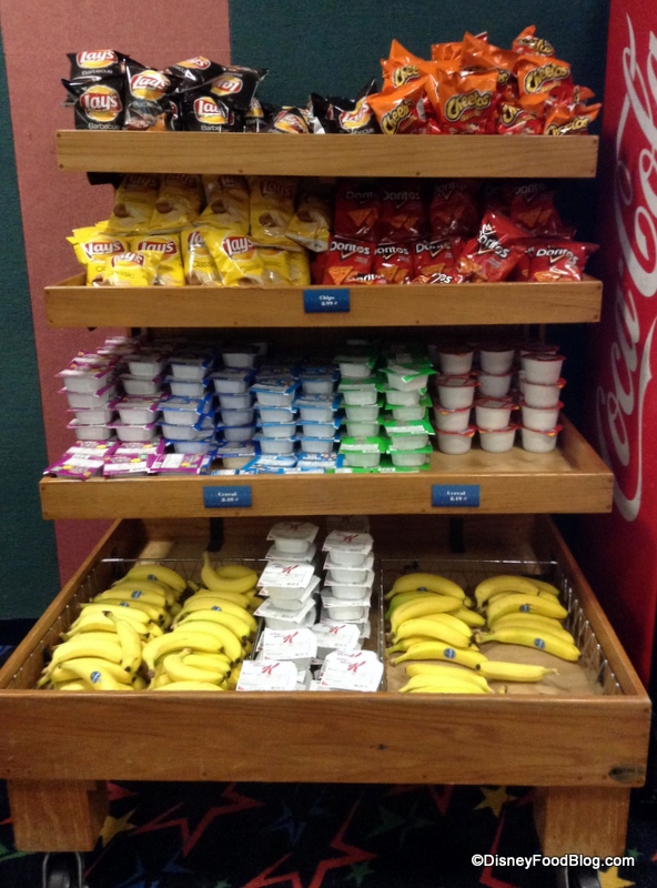 Chips, fruits, and cereals are housed next to a huge array of refrigerated beverages.