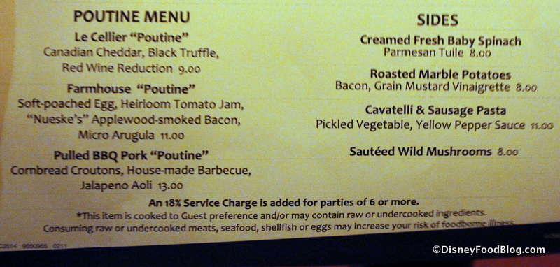 Le Cellier has also introduced a full “Poutine” Menu. Since these are not true poutine — Cheese Curds and Brown Gravy on Fries — the restaurant wisely puts the word “poutine” in quotation marks. Yes. Like that.