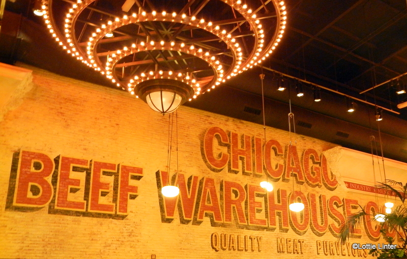 One of the big walls is vintage-style painted brickwork, but it has been made to look like they pulled down the plaster from a more modern steak restaurant to discover the old meat warehouse underneath. The conservatory area has black and white tiled floors and looks towards Lake Disney, McDonald’s, and the building that houses the Rainforest Café.
