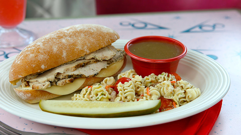 Or perhaps you’d like to try the turkey dip on a potato grinder roll. It’s served with provolone cheese and turkey au jus for dipping, plus a side of pasta salad.