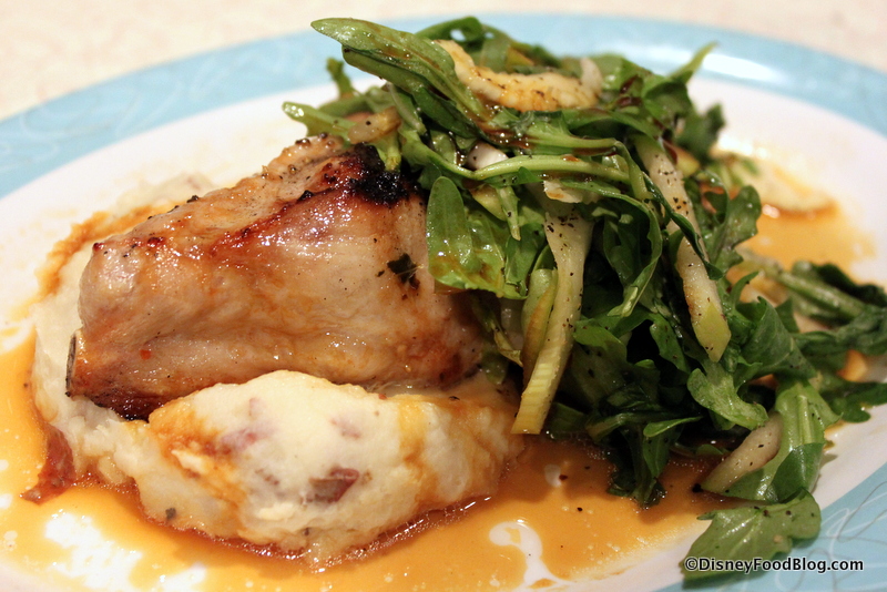 The dish comes with two sides: Arugula, Fennel, and Apple Salad and Garlic Mashed Potatoes. You should note that the salad is sautéed and served over the Pork Chop — good to be aware of if you were expecting something raw and on the side.