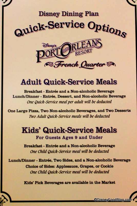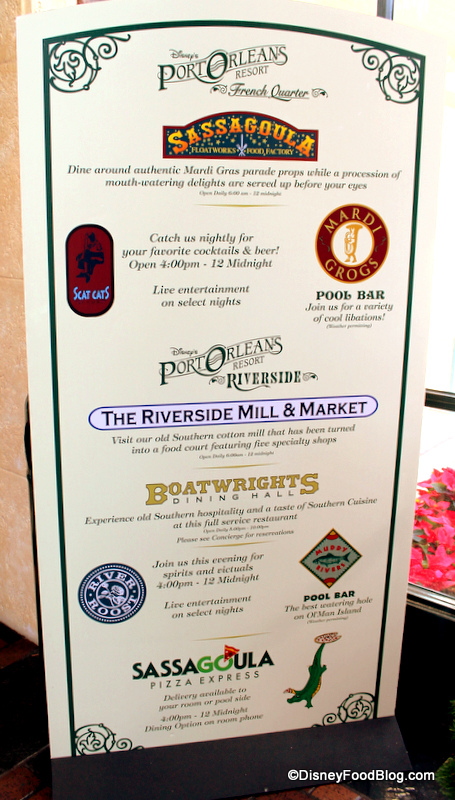 A display reminds guests of their dining choices while visiting the Port Orleans resorts.