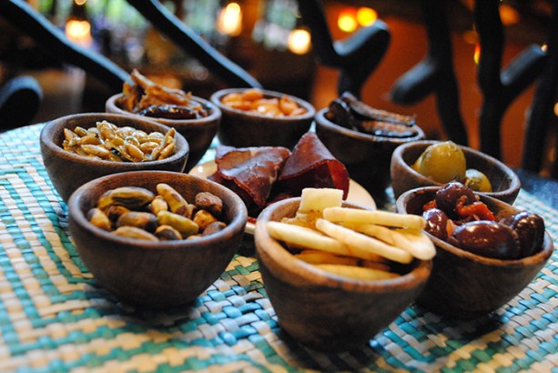 Also available is an assortment of African-inspired tapas, featuring dates, cumin green olives, sambal Calamata olives, Bresaola, sea salt pistachios, and preserved lemon artichoke hearts served with dried banana and pumpkin seed crisps.