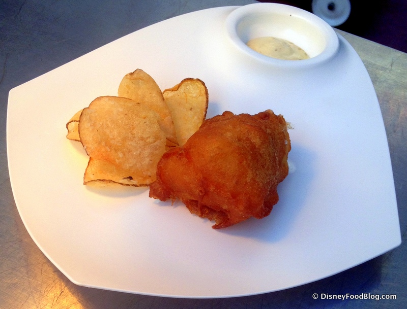 The dish came together with Beer-Battered Sustainable Bass; and in place of thick cut, fry-style chips, they served it with Vinegar Potato Chips.