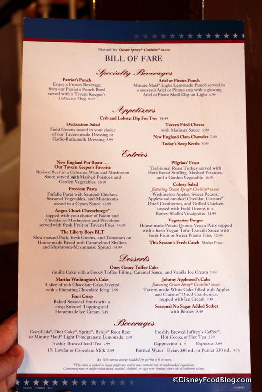 If you’ve never dined at Liberty Tree Tavern, you should be aware that Lunch and Dinner are different types of meals. While dinner is an all-you-care-to-enjoy meal (Thanksgiving!!!), served family style, lunch is an a la carte situation. You’ll choose each of your courses from the menu and pay for everything accordingly, rather than a set per-person price.