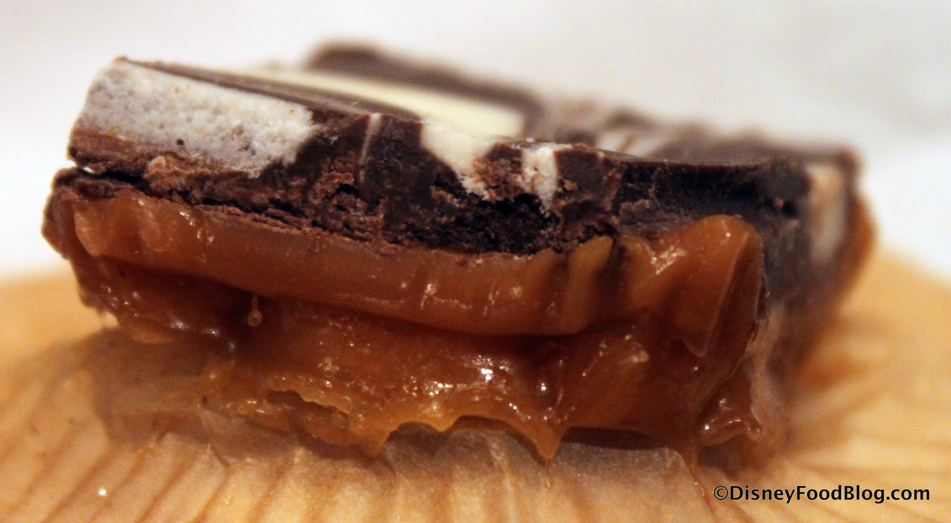 A view from the side gives you a better idea of what you’ll be enjoying — a thick plate of that swirled Dark and White Chocolate sits atop straight Caramel.