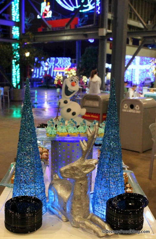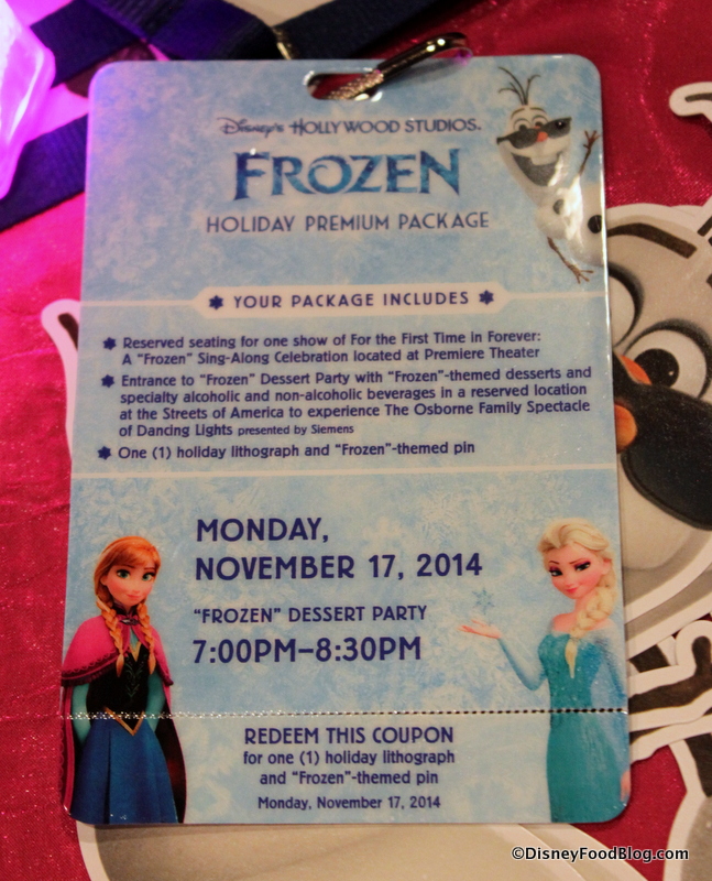 On a recent trip to Walt Disney World to check out some of the early holiday decorations and events, I bought a ticket for the Frozen Holiday Premium Package. This package includes reserved viewing in the Premiere Theater for the “For the First Time in Forever: A Frozen Sing-Along Celebration”, plus a unique Holiday Lithograph and Frozen Pin. There’s also a Frozen Dessert Party — which includes an all you care to enjoy spread of sweets and beverages. And the party was taking place right underneath the Osborne Family Spectacle of Dancing Lights in a reserved area!!
