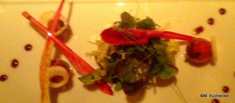 The next course was a salad, or salad-like, dish. Brad had his choice of Pintade Fermiere Verrine with Fuji Apples and Walnuts, or Octopus “A La Plancha” with Black Garlic Aioli. He opted for the octopus.
