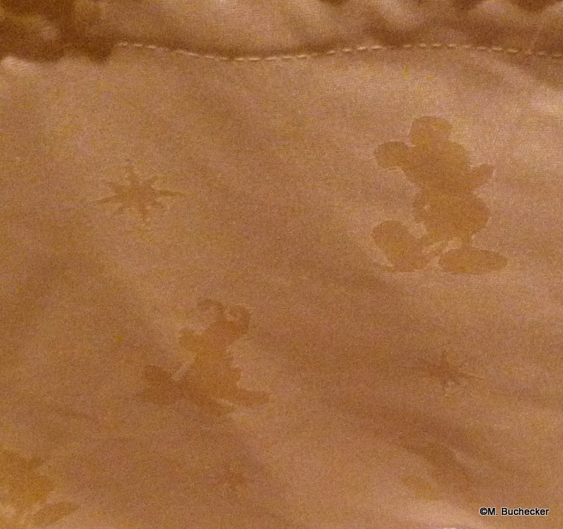 You dispose of the washcloths in a wicker basket, which is lined with fabric that has Mickey Mouse and Pluto. This was the only instance of any Disney characters I saw.