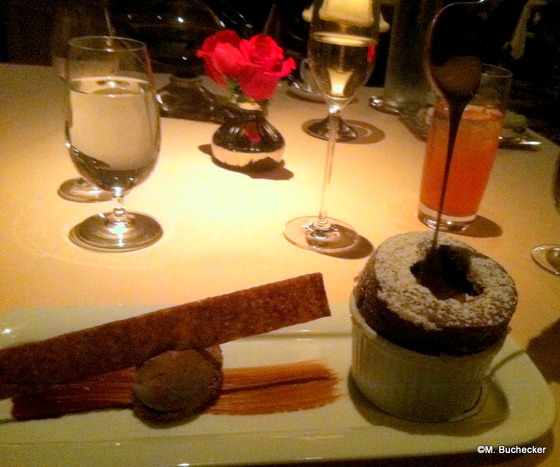 Dessert! Our choices were Tanzanian Chocolate Timbale with Orange Scented Milk Chocolate Gelato, Apple Quark Panna Cotta, Caramelized Banana Gateau, Vanilla Bean Crème Brulee, Grand Marnier Soufflé, or Hawaiian Kona Chocolate Soufflé. Hmm, Chocolate and Kona? Yes please! We both ordered the chocolate soufflé.