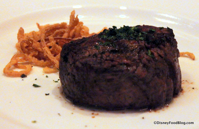 We also decided that we couldn’t pass up the chance to compare the Filet Mignon with others at Disney, so that was our next choice. Served with the same French Fried Onion Garnish, the Filet was cooked to a perfect medium rare temperature as well. The Filet remains on the menu, of course.