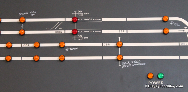 The switchboard provides another reminder of your Tinsel Town location, noting stops in Santa Monica, Venice, and even a subway transfer to Culver City. (Notice the 1920s – 30s repair dates written next to some of the signal lights! They’re admittedly easier to see in person, but you can click the images to enlarge.)