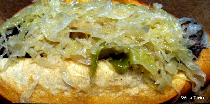 The bratwurst comes on a very large crusty bun topped with loads of sauerkraut. He said the sauerkraut was alright and the bratwurst itself was delicious, but he felt that there was just too much bread. The bun was quite large and had a pretty tough and crusty consistency. He still enjoyed it and gave it a score of 6.