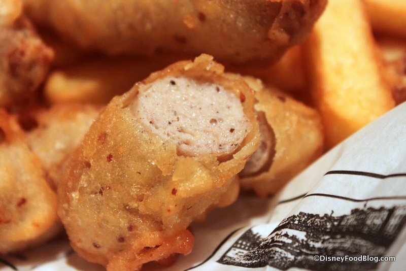 DebC — You’ve got the idea. I would say that the batter on the sausages is less like a bread casing that you find on a corndog, and more like what you’d find on, say, chicken fingers. It’s not as thick as the batter on the fish. But they’re SO good!