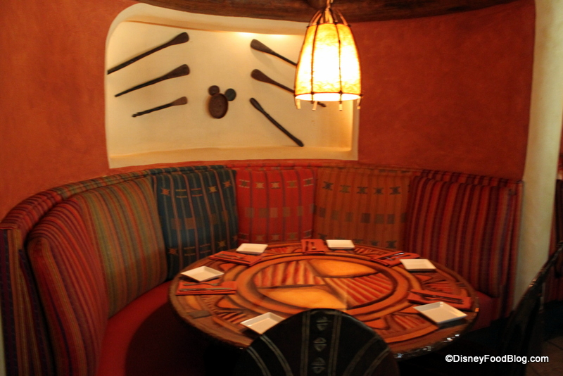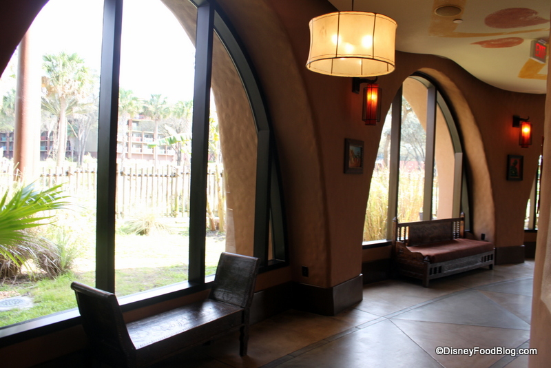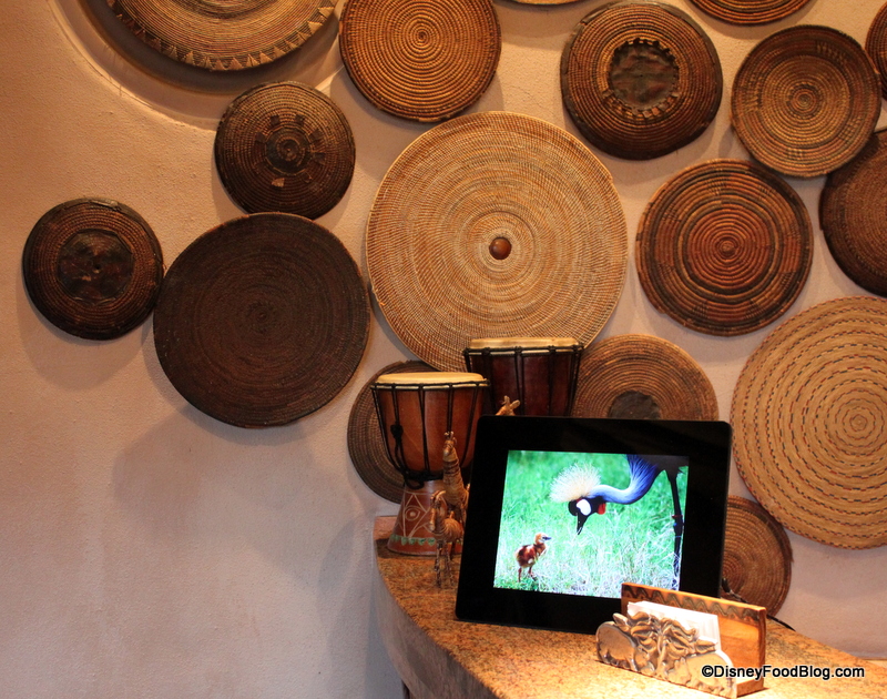 As with all of the other restaurants at Animal Kingdom Lodge, Sanaa has been thoughtfully named. The word “sanaa” is Swahili for “art”. Step up to the restaurant’s entrance, and you start to see why. Hand woven trays decorate the area behind the podium and beautiful beads line the counter.