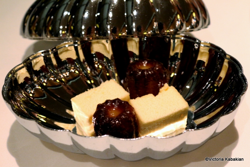 Oh, but wait there’s more! After dessert they serve a variety of mignardises including lemon diamonds, homemade lollipops (lemon and mint flavors), nougat, chocolates, homemade orange marshmallows, and cannelles (a small, tender French pastry). Anything you can’t finish (except the lemon diamonds and those crispy oval things, which are too delicate) is wrapped up in a doggy bag to take home.