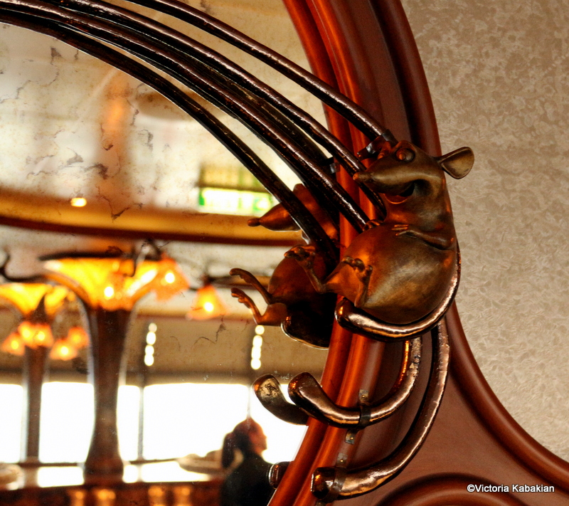 Details featuring Remy and his brother Emile can be found throughout the main dining room. Remy is found hidden in glass atop one of the vibrant chandeliers. He is carved in wood on the backs of chairs. Remy and Emile are stitched into the fabric of the booths and their figures frame every mirror in the space.
