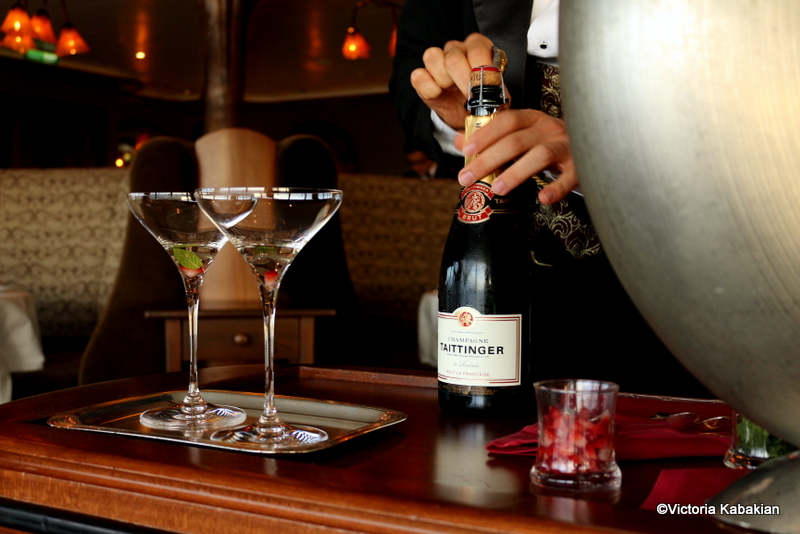 The Colette is prepared tableside and includes a bit of strawberry, a mint leaf, some Absolut Pears, and Taittinger Champagne. By mixing the Champagne with a spirit, the bubbles dissipate, but by adding a small bit of dried apricot at the end, it creates an effervescent effect that mimics the natural bubbles in Champagne. It’s like a fun magic trick that you get to drink. Cheers.