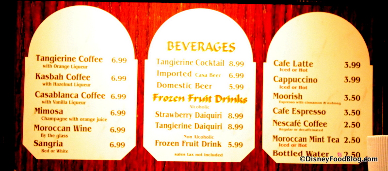 Recently went to Tangierine Cafe with my meat and potatoe eating husband. Hubby has actually gotten a lot better about trying things outside his box as he has been with me for 20 years and I’m a 2nd generation Greek american…Anyways we split a Lamb Shwarma platter. I ordered an extra bread $1.50 which came on its own paper plate and side of French fries which came in one of those rectangular paper Bowles. We also ordered two sodas…everything together came to $24.00. A great bargain at Disney and even hubby agreed it was much better then the usual hamburger for him. We were both totally full!!! One thing that happened is that our fountain sodas were flat lack of carbonation. When we told the MGR he ran out and got us 48oz bottled cokes to replace them!!! That was great. The staff was friendly and accommodating.