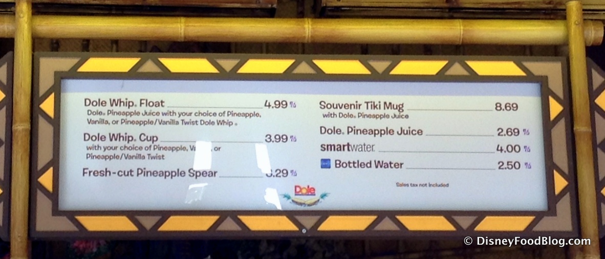 You can still enjoy Dole Whip, Dole Whip Swirl, Dole Whip Floats, fresh spears of Pineapple, and Dole Pineapple Juice, in addition to other drink options. (UPDATE: Please note, the option for Vanilla Swirl is no longer on the Aloha Isle menu.) The Souvenir Tiki Mug is also still on offer.