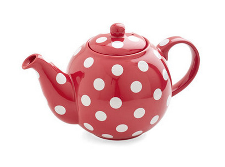 enjoys tea time with a Minnie Mouse inspired tea pot. Love the polka dots!