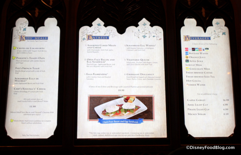 Because every meal offering at Be Our Guest works a little differently, let’s briefly go through the breakfast logistics. When you check in outside for your ADR, you may take some time to look at the printed menus available. The front, of course, has all the meal options for ordering.