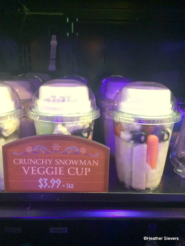 cooler in the snack area of Olaf’s Snow Fest consists of a few prepackaged eats and bottled soda & water. Here you can grab a Crunchy Snowman Veggie Cup. The “Snowman” is filled with fresh veggies like jicama, carrots, celery, and cauliflower. It’s packaged to look like a snowman and comes with a side of ranch dressing for dipping.