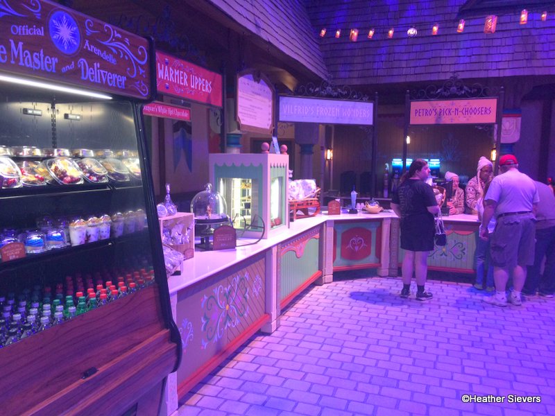 The lighting inside of Olaf’s Snow Fest is very pink, so it made for a tough photo spot. Adorable nonetheless though! A snack area in the corner is set up so that visitors to Arendelle can recharge after playing in the snow. Although there is only one spot to order, the area is organized to look like separate food booths with different offerings.