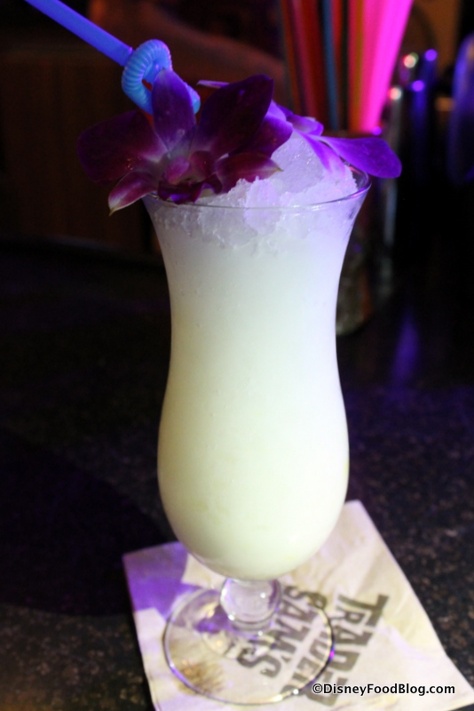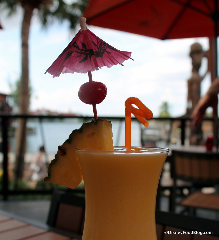 That’s Dole Whip, my friends! And the Spikey Pineapple is a huge, cold hurricane glass full of it — in a form meant for sipping! Coming in at $10.25, this is a vacation in a glass: a classic Disney flavor with the soft serve, a hint of rum to add to your vacation pleasure, all topped off with a pineapple wedge, cherry, and an umbrella. It’s cold and refreshing, yummy and whimsical. Well done, Tiki Terrace!