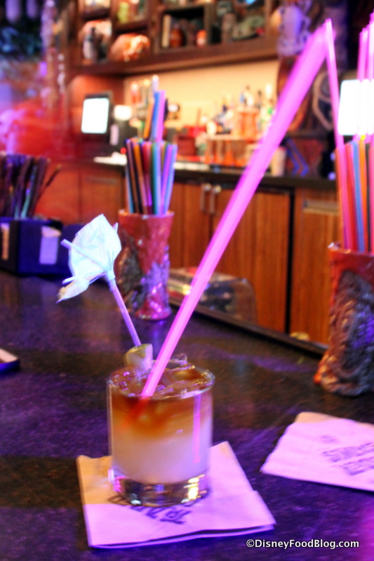 We couldn’t resist trying a few of the brews that Sam mixed up just for the Grog Grotto, so we started with the Dark & Tropical Stormy: Gosling’s Black Seal Rum, fresh lime juice, Ginger Beer, and Falernum. This first picture is a pan out, because as with every drink here, you’ve gotta check out the straw.