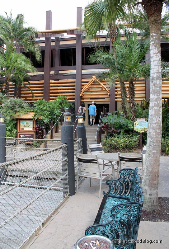 At 3 pm, we decided we’d better stake out our spot, so we went to the inside door of the Grog Grotto, where two Cast Members were waiting. We were told we were the first for the day, and could start the line outside at the metal bench pictured below.